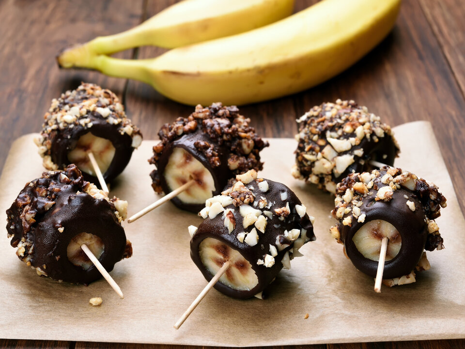 Banana em rodelas com calda de chocolate rico em cacau. Polvilhado com amêndoas filetadas.
